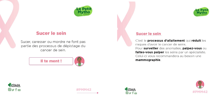 Intrigué par la question de la succion des seins, nous avions interrogé des spécialistes en santé publique. Ils s’inscrivent tous en faux contre cette information et clarifient. Le 08 octobre 2022, la Fondation des jeunes amazones pour le développement (FJAD) a tenu un Space sur Twitter sur la thématique. La modératrice Bagnan Aïssathou, technicienne en santé publique et surveillance épidémiologique comme mentionné sur son profil Twitter et Nelly Gaba, sage-femme d’État sont revenus sur le sujet. Elles ont toutes soutenu que la succion des seins ne prévient pas le cancer de sein. Toutefois, elle peut aider à détecter des symptômes comme les nodules lors de la palpation.  Mais avant, le 5 octobre 2022, dans une publication sur la page Facebook Asma Santé, on voit une campagne qui dément cette information liée à la succion du sein.